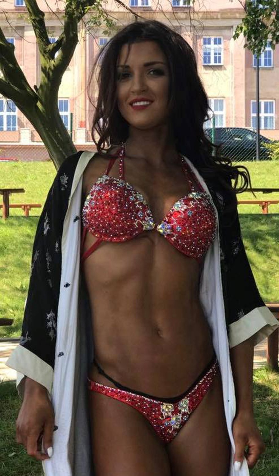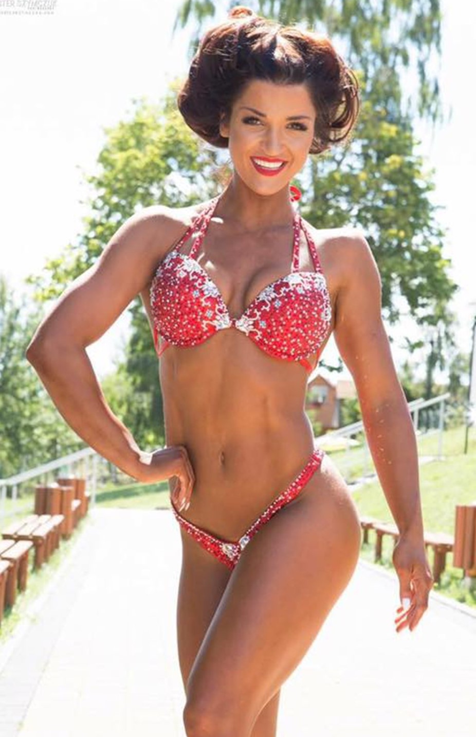 A custom-made bikini for an IFBB bikini fitness competitor. This striking red set was carefully embellished with various types of Swarovski crystals, designed to enhance stage presence and sparkle under the spotlight.