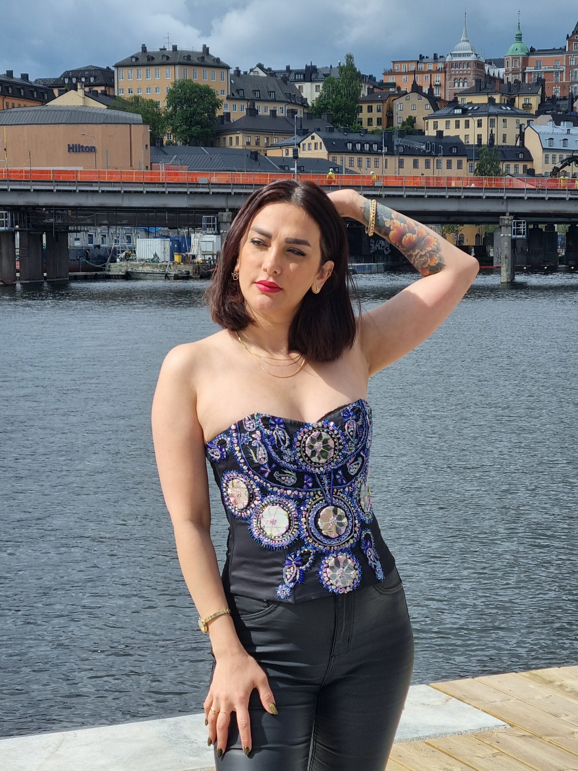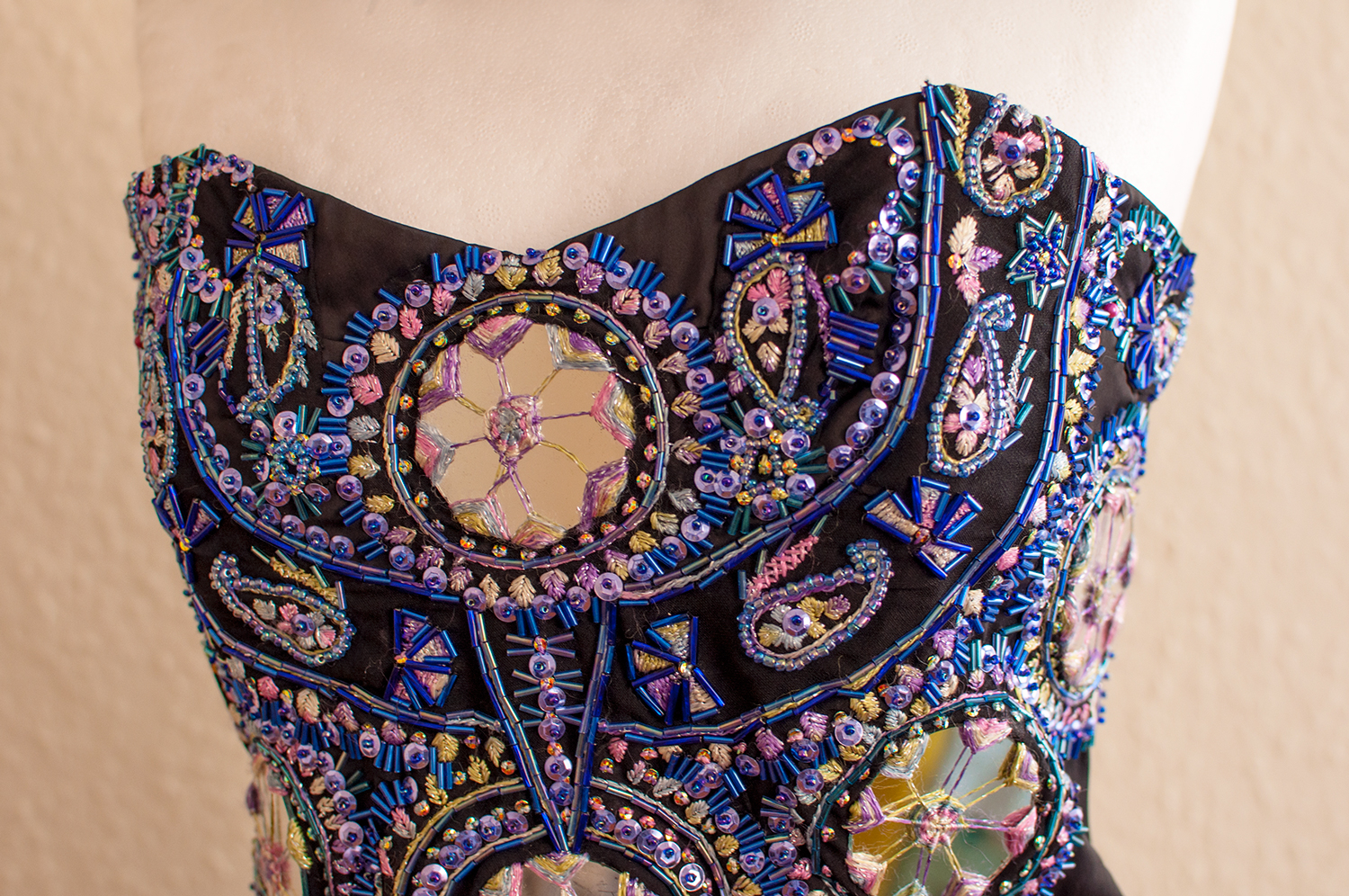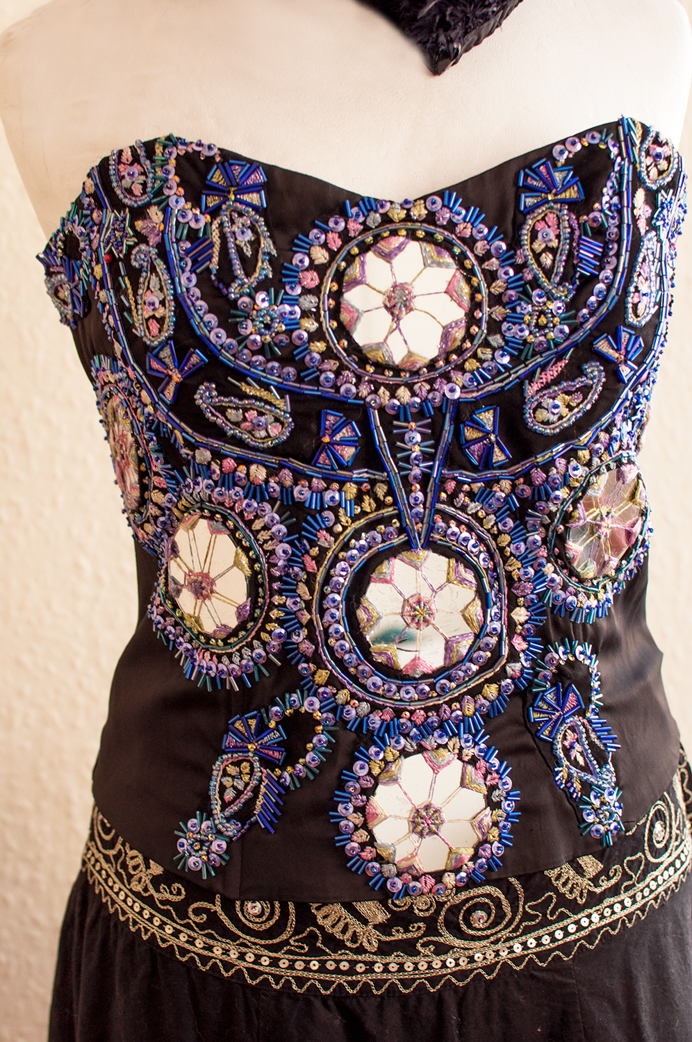 A black satin corset decorated with reflective mirrors, intricate embroidery, shimmering sequins, and glass beads. Inspired by the vibrant patterns of traditional Indian textiles and the bold glamour of burlesque, this piece brings together cultural richness and theatrical edge. The mirrors catch and reflect stage lights beautifully, adding a captivating sparkle to any performance.