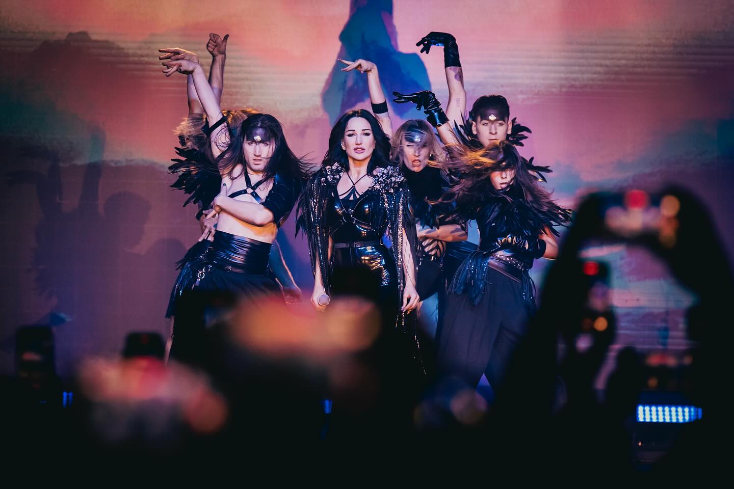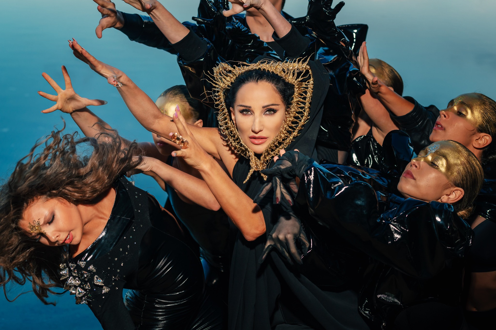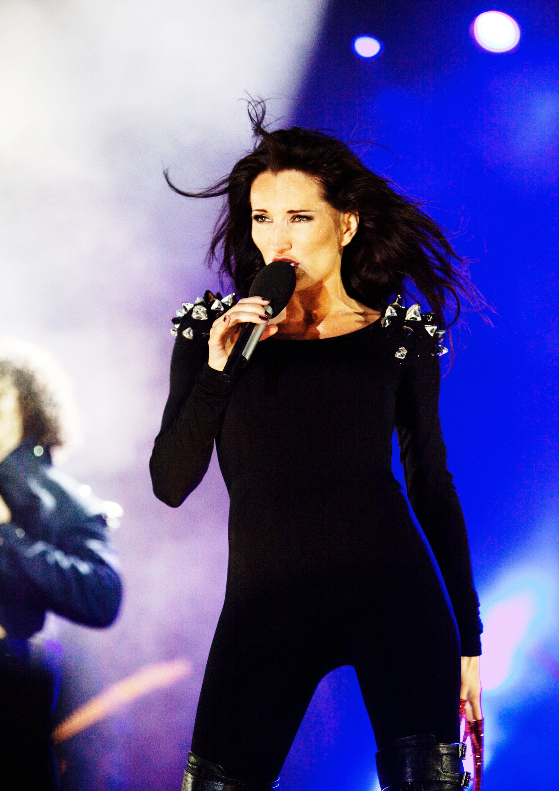 Tight-fitting black jumpsuit made from stretch fabric, originally created years ago and gradually transformed over time. Designed especially for Justyna Steczkowska as a stage costume. The look is elevated by striking crystal spikes on the shoulders, crafted from triangular Swarovski crystals. A bold, sculptural design with a futuristic edge – continually evolving, yet timeless on stage.
