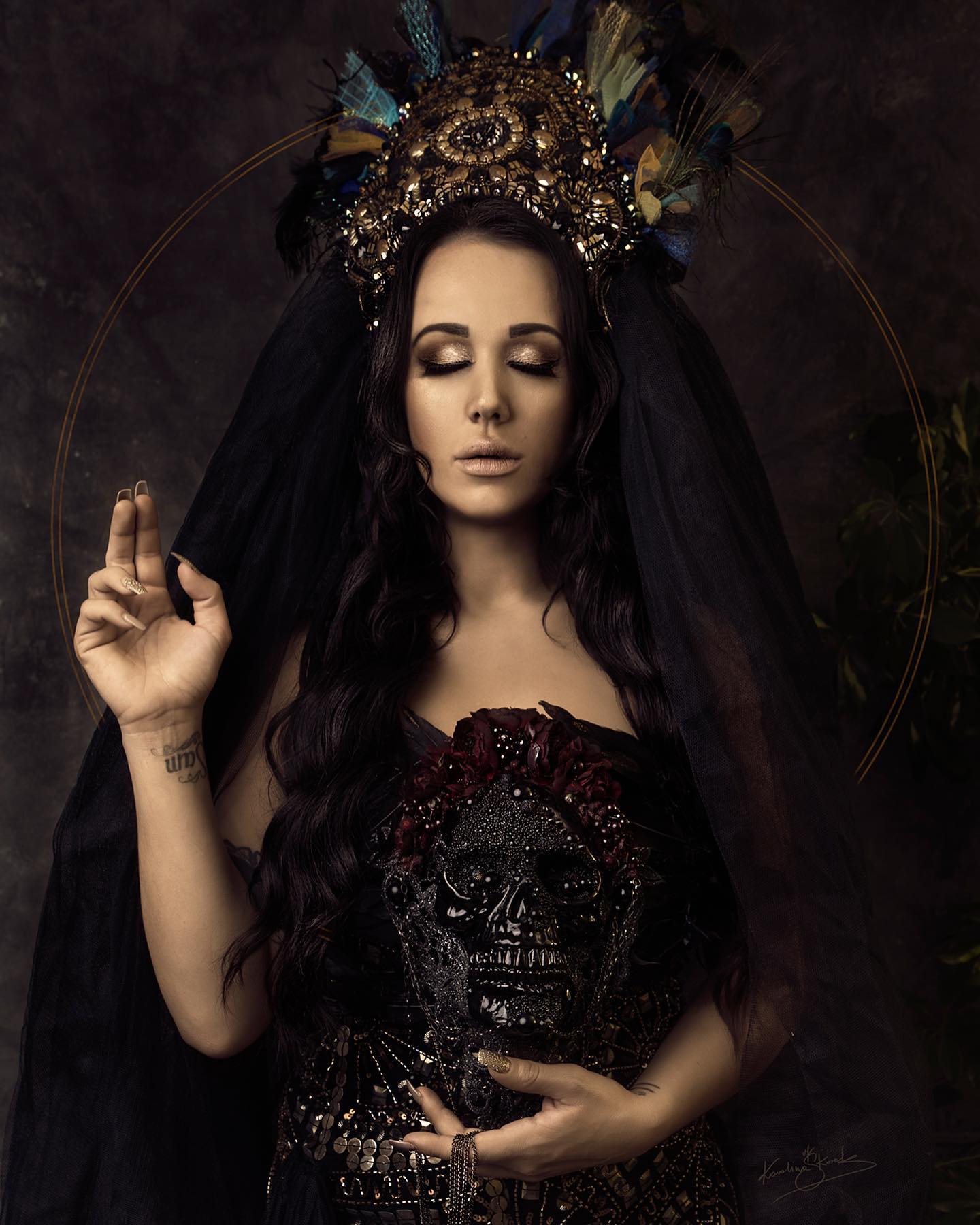 This dramatic costume includes a floor-length black tulle dress and a matching headpiece adorned with peacock feathers – a symbol of regality and vision.
