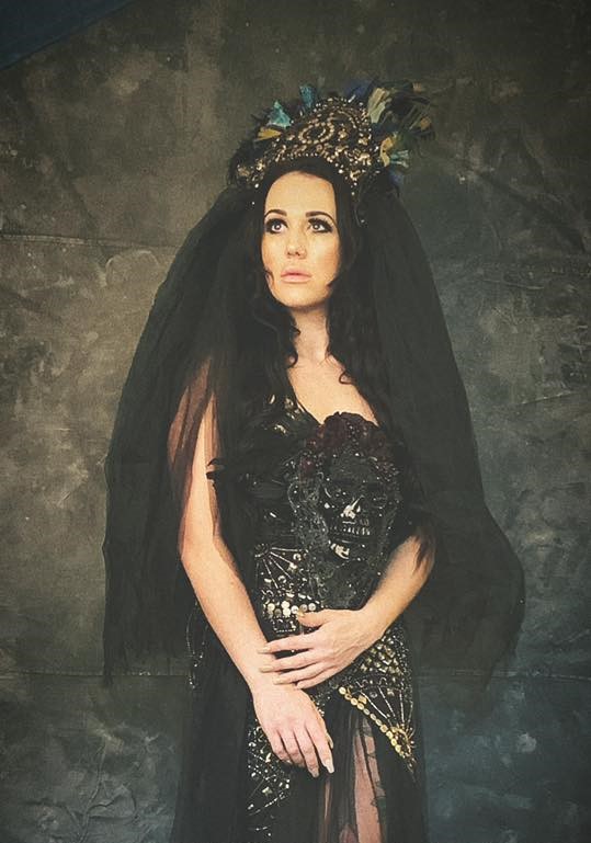 The headpiece mirrors the richness of the dress: golden and black beads, sequins, and stones are set among soft tulle, silk, and chiffon, framing the face with elegance and theatrical intensity.