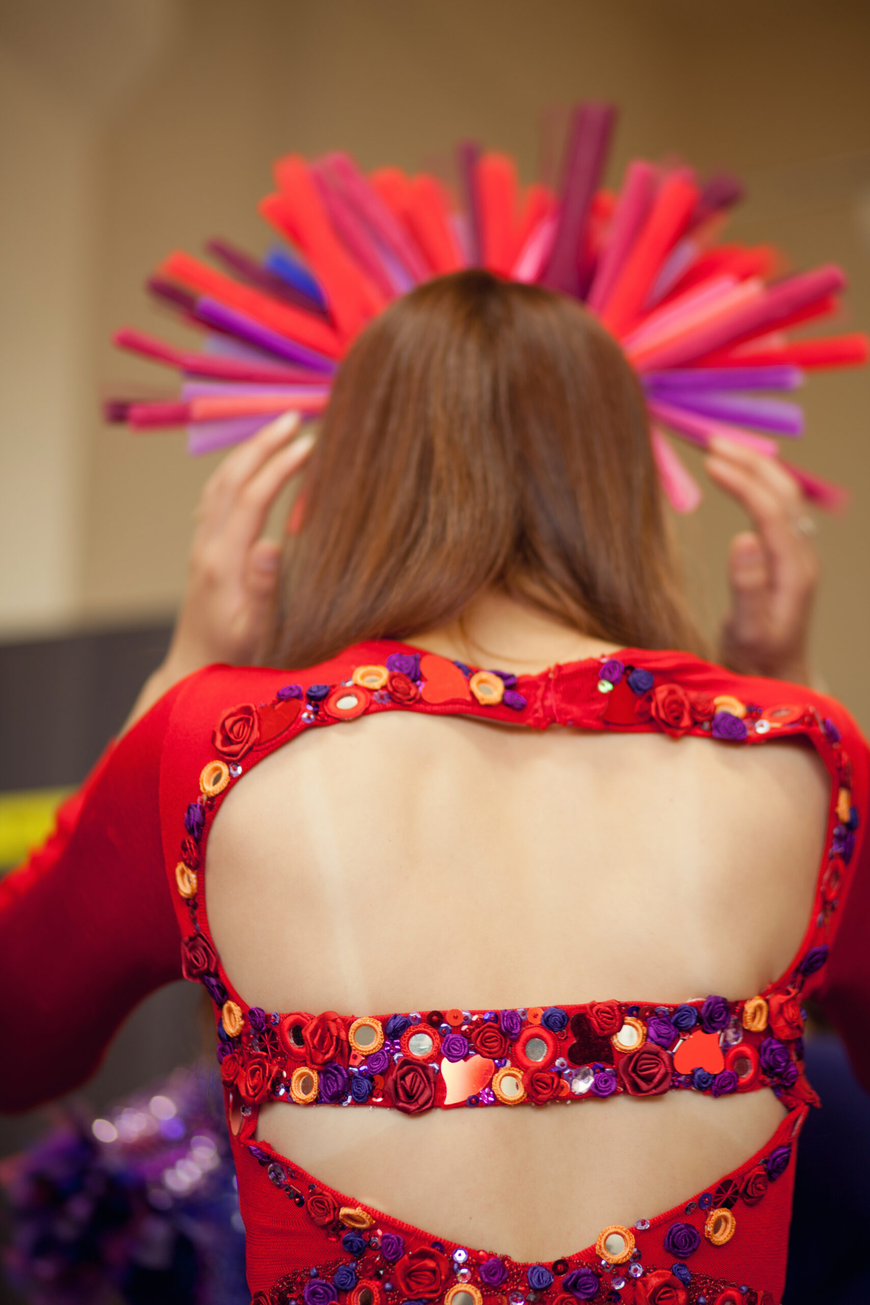 Hand-embroidered with intricate details, the dress features tiny mirrors, delicate roses, shimmering sequins, beads and Swarovski crystals. Each element was placed to catch the light and amplify movement, creating a sense of ancient magic meeting modern stage presence.