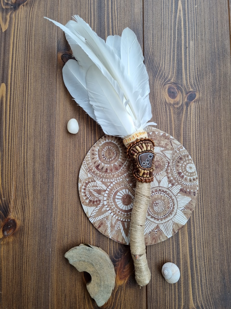 A handcrafted shamanic feather fan (smudge fan) created for a Swedish artist deeply connected to nature, music, and feminine alchemy. This ceremonial piece combines feathers, wood, stone, natural cord, and wooden beads to form a spiritual tool infused with intention. Designed to accompany rituals, performances, and meditative practices, it reflects a deep respect for Earth-based traditions and sacred energy work.