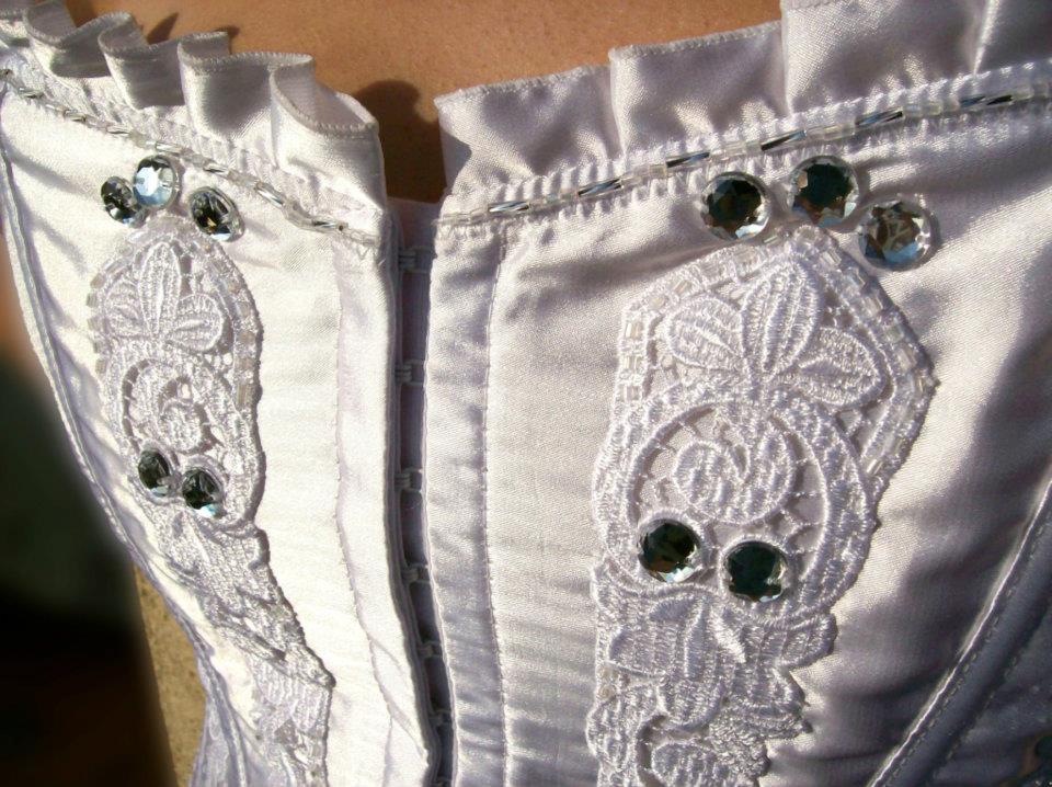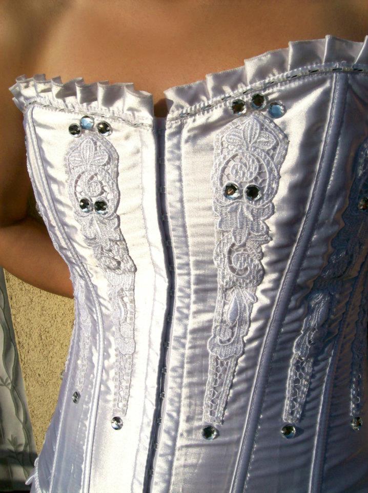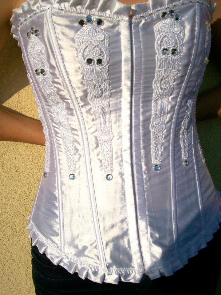 A satin white corset delicately adorned with soft lace appliqués, shimmering sequins, and sparkling crystals. Created especially for a bridal-themed photo shoot, this piece evokes elegance, purity, and timeless romance. Every detail was added by hand to capture a sense of ethereal beauty and refined craftsmanship.